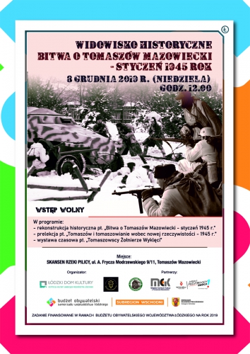 W niedzielę 8 grudnia 2019 r. na terenie Skansenu Rzeki Pilicy w Tomaszowie Mazowieckim odbyło się WIDOWISKO HISTORYCZNE – BITWA O TOMASZÓW MAZOWIECKI – STYCZEŃ 1945 rok, zrealizowane w ramach Budżetu Obywatelskiego Województwa Łódzkiego na rok 2019.